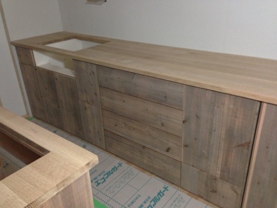 引き出し部分は「杉の鉄サビなめらか仕上げ(まだ無塗装、今後塗る予定)」で化粧してもらいました♪